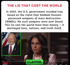 Who is James Clapper, and what does he have to do with Iraq? He and his team created the false narrative that Iraq had weapons of mass destruction that led to the war in Iraq in 2003.