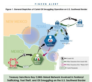 The allegations come against a much larger backdrop. On May 1, 2025, the Financial Crimes Enforcement Network (FinCEN), in coordination with OFAC, the DEA, FBI, and Homeland Security Investigations, issued an anti–money laundering alert warning that the Jalisco New Generation Cartel, the Sinaloa Cartel, the Gulf Cartel, and other Mexico-based transnational criminal organizations are engaged in industrial-scale theft and smuggling of Pemex crude across the U.S. southwest border. The cartels and their huachicoleros — oil thieves — primarily obtain crude by bribing corrupt Pemex employees and local officials, but also by drilling illegal taps into pipelines, stealing from refineries, and threatening workers. These operations have fueled violence and corruption across Mexico and, in some cases, triggered catastrophic pipeline explosions.