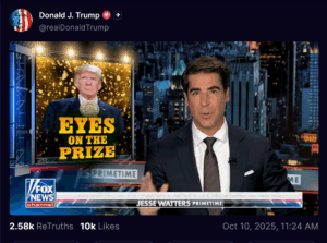 Jesse Watters Primetime ~ The President of Peace… October 10, 2025 by Suzanne Maresca Click the image above to watch… “Remember the whisper that changed the world? Bush heard War. Trump heard Peace, and the world celebrated.” Share this: Click to share on X (Opens in new window) X Click to share on Facebook (Opens in new window) Facebook Click to share on Reddit (Opens in new window) Reddit Click to email a link to a friend (Opens in new window) Email