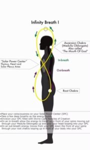 If we can, it is best to perform the Infinity Breath twice a day, 12 rotations or whatever is comfortable for you. This can be accompanied by the “Accordion Breath” that keeps the figure eight of the Infinity sign inside your body as you breath is 5 rotations of five breaths, the last one of each rotation extending from your root chakra up through your crown and then looping the breath done through the body on the inside of the spine, through the root chakra into the Earth.