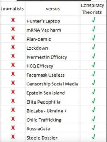 There’s a graphic out that lists all the issues that “conspiracy theorists” have been proven right on and mainstream journalists have been proven wrong on. Where is it? There it is….
