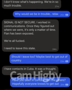 - Chat logs showing panic among activists, like the infamous screenshot where users freak out: “SIGNAL IS NOT SECURE… Flan has been exposed. We’re all fucked. I need to leave this state.” And responses like “Should I leave too? Maybe best to get out of country… I have contacts in Cuba.” (Watermarked by Cam himself—iconic).