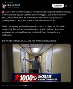 Newsom’s only response came via his official press office’s X account (@GovPressOffice), which posted an AI-generated attempt to smear young Nick rather than answer to the $170M+ in daycare and hospice fraud. No need to dignify that stupidity with a share.