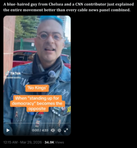 This guy lives in Chelsea โ one of the most liberal neighborhoods in Manhattan. He has blue hair. Everyone in his building kept asking him if he went to the No Kings rally. He politely said no. Then he turned on his camera and said what he really thinks.