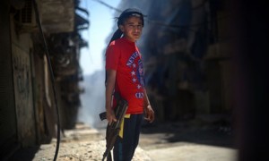 A Syrian boy holds an AK-47 assault rifle in Aleppo