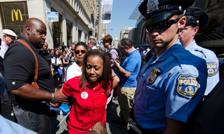 A worker is detained by police during a protest to push fast-food chains to pay their employees at least $15 an hour, outside a McDonald’s restaurant Thursday, Sept. 4, 2014, in Philadelphia. The protest movement, which is backed financially by the Service Employees International Union and others, has gained national attention at a time when the wage gap between the poor and the rich has become a hot political issue. (AP Photo/Matt Rourke)